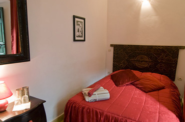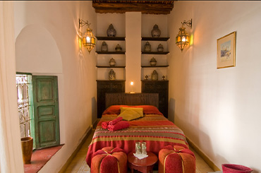Chambre double, aux lumières d’Orient, ouverte sur le patio, lit double, salle de bain en tadellakt, douche et toilettes privées.
