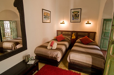 Chambre double, à l’étage, avec vue sur le patio, au style traditionnel marocain, lits jumeaux, climatisation, salle de bain en tadellakt, avec douche et toilettes privées.